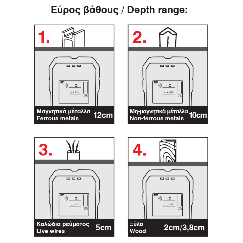 *Η μέτρηση βάθους (σε mm) για το ανιχνευόμενο αντικείμενο αναφέρεται σε μία τυποποιημένη χαλύβδινη ράβδος με διάμετρο 18mm ή σωλήνα χαλκού με διάμετρο 18mm . H ακρίβεια της αξίας σχετίζεται με το σχήμα και το υλικό του ανιχνευόμενου μετάλλου, την κατανομή της σάρωσης στο αντικείμενο και τις ιδιότητες των μέσων που περιβάλλουν.